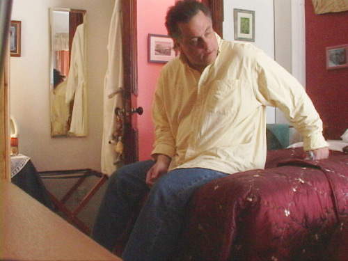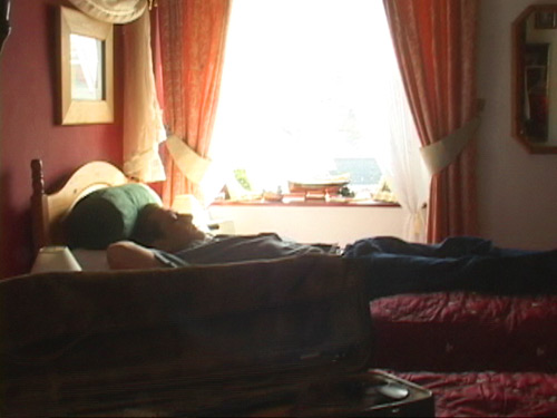 Lewin sleeping, inside of the Hodson's bed and breakfast.